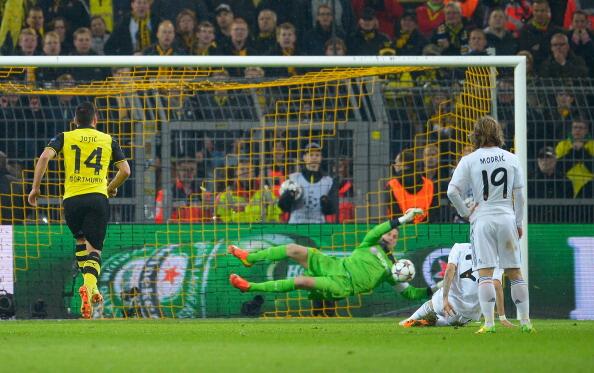 El éxito no se alcanza sin sufrimiento y el Real Madrid se sobrepuso a las adversidades en el Signal Iduna Park para clasificarse para las semifinales de la Champions League. Todos los análisis previos coincidían en que el primer cuarto de hora sería clave y los blancos no sólo no encajaron gol sino que estuvieron cerca de hacerlo. Centro de Coentrão y el balón golpeó en la mano de Piszczek. Di María lanzó el penalti, pero Weidenfeller le adivinó el golpeo y evitó el tanto en el 17’.