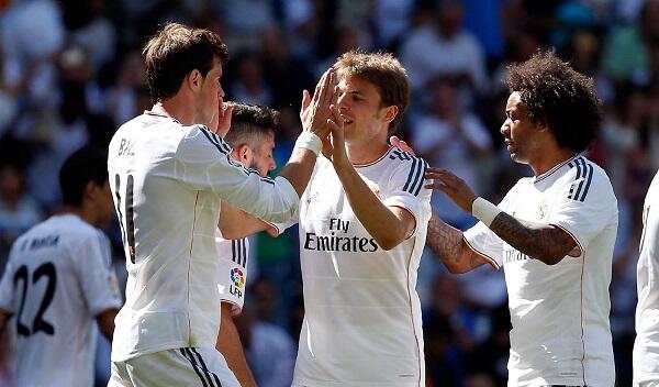 El Real Madrid se despidió del Bernabéu con victoria en un partido en el que tres de los cuatro goles se vieron en los cinco últimos minutos. La primera mitad finalizó sin ellos, pese a que los blancos dominaron de forma abrumadora. Los números así lo evidenciaron. Tuvieron el 72% de la posesión y protagonizaron todas las jugadas de peligro. La primera llegó a los 13 minutos. Marcelo centró y Benzema, en el segundo palo, remató alto con la cabeza. Los madridistas lo volvieron a intentar nueve minutos más tarde. Di María sacó el córner y el balón llegó a los pies de Ramos, que recortó a Javi López y remató con la izquierda, pero Casilla salvó a los suyos.