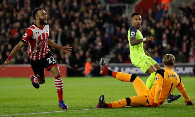 El Liverpool comenzó controlando las acciones y dominando la posesión del balón, pero, salvo un remate de Roberto Firmino a las manos de Foster, sin generar demasiado peligro. A diferencia de los reds, el Southampton aprovechó una de las primeras ocasiones que tuvo al minuto 20. Balón filtrado para Redmond, quien batió el achique de Loris Karius para adelantar a los locales. Los pupilos de Klopp sintieron el golpe y buscaron una reacción. Sin embargo, Karius fue el más protagonista del primer tiempo al estirarse para evitar un segundo gol de Redmond al filo del descanso.