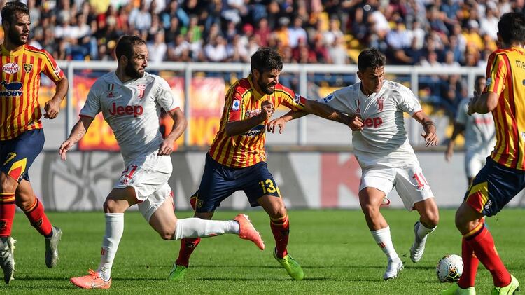 Sarri opta por las rotaciones y presenta como novedades Danilo, Emre Can y Bentancur en lugar de Cuadrado, Khedira y Matuidi. Bernardeschi vuelve a ser mediapunta por detrás de Dybala e Higuaín. Pero el Lecce entra muy bien en el partido y gozan de la primera ocasión con Petriccione. La Juve tiene que activarse ante la agresividad local y lo hace: llega una doble ocasión para Bernardeschi y Dybala y un gol anulado por el VAR por fuera de juego de Higuaín. De ahí hasta el final es un monólogo bianconero con ocasiones para los dos delanteros argentinos y una gran parada de Gabriel en un mano a mano ante la Joya. Pero al descanso se llega sin goles.